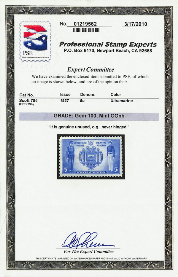 5435 nh 794 image1937, 5¢ Navy (Scott 794), o.g., never hinged, Superb, with 2010 P.S.E. certificate graded GEM 100.