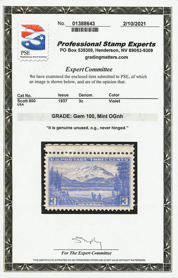 5439 nh 800 image1937, 3¢ Alaska (Scott 800), o.g., never hinged, Superb, with 2021 P.S.E. certificate graded GEM 100.