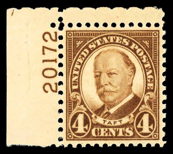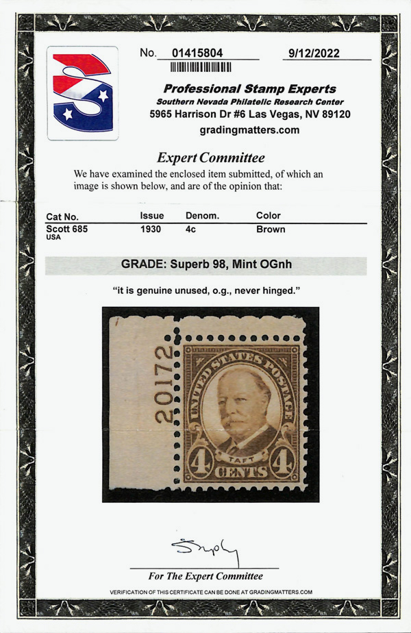 5406 nh 685 image1930, 4¢ Taft, rotary press printing (Scott 685), plate number single, o.g., never hinged, Superb, with 2022 P.S.E. certificate graded SUP 98.