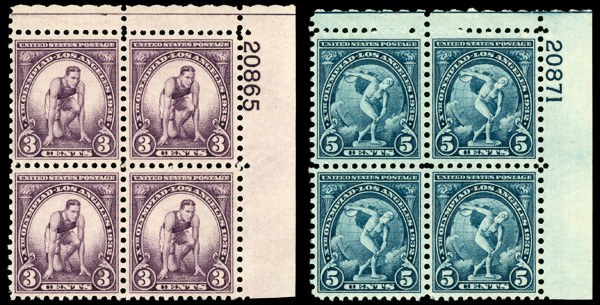 5412 nhbl 718-719 image1932, Summer Olympics complete (Scott 718-719), plate blocks of 4, o.g., never hinged, Very Fine to Extremely Fine.