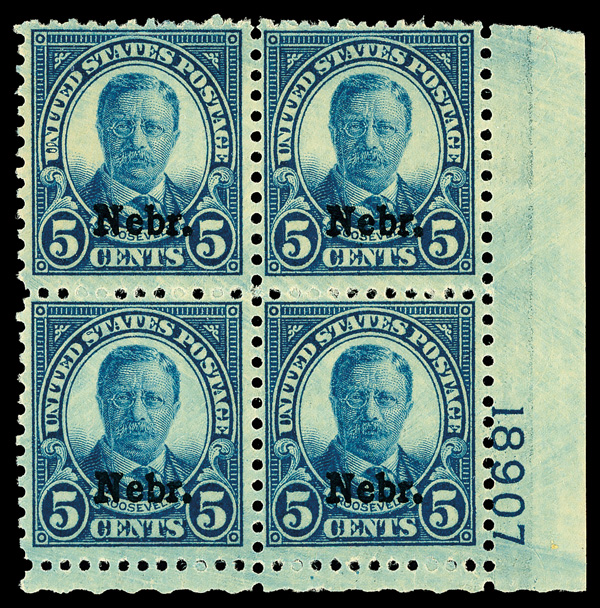 5401 nhbl 674 image1929, 5¢ Nebr. (Scott 674), bottom right plate block of 4 with plate number 18907, Lively, strong color, o.g., never hinged; minor gum skips, Fine to Very Fine.