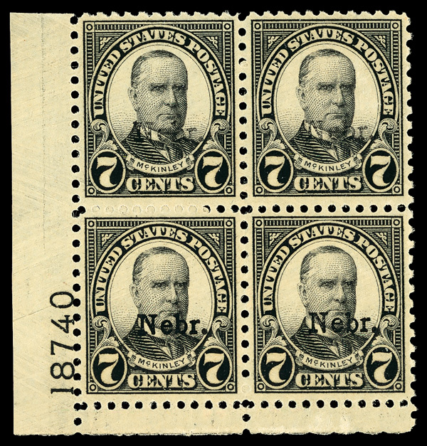 5402 nhbl 676 image1929, 7¢ Nebr. (Scott 676), bottom left plate block of 4 with plate number 18740, Clean, crisp coloration, o.g., never hinged, Fine to Very Fine.