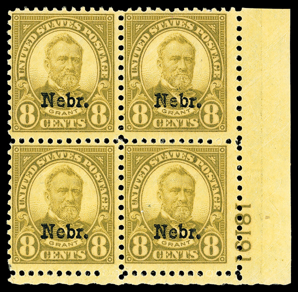 5403 nhbl 677 image1929, 8¢ Nebr. (Scott 677), bottom right plate block of 4 with plate number 18191, Strong color that remains crisp, o.g., never hinged, Fine to Very Fine.