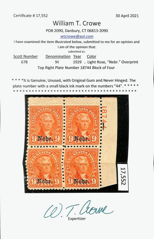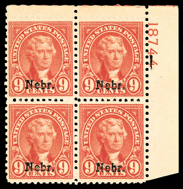 5404 nhbl 678 image1929, 9¢ Nebr. (Scott 678), top right plate block of 4 with plate number 18744, Clean, bold color presentation, o.g., never hinged; small black ink mark on plate numbers "44", Very Fine, with 2021 Crowe certificate.