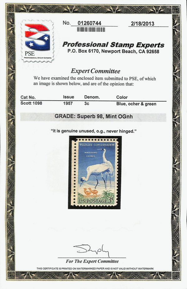 5659 nh 1098 image1957, 3¢ Wildlife Conservation: Whooping Cranes (Scott 1098), o.g., never hinged, Superb, with 2013 P.S.E. certificate graded SUP 98.