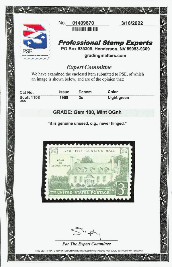5666 nh 1108 image1958, 3¢ Gunston Hall (Scott 1108), o.g., never hinged, Superb, with 2022 P.S.E. certificate graded GEM 100.
