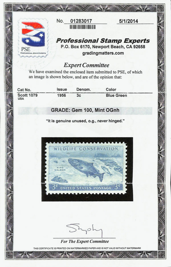 5641 nh 1079 image1956, 3¢ Wildlife Conservation: Salmon (Scott 1079), o.g., never hinged, Superb, with 2014 P.S.E. certificate graded GEM 100.