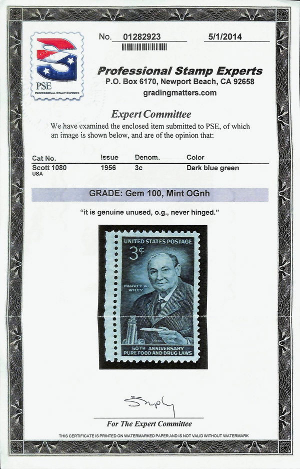 5642 nh 1080 image1956, 3¢ Pure Food & Drug Laws (Scott 1080), o.g., never hinged, Superb, with 2014 P.S.E. certificate graded GEM 100.