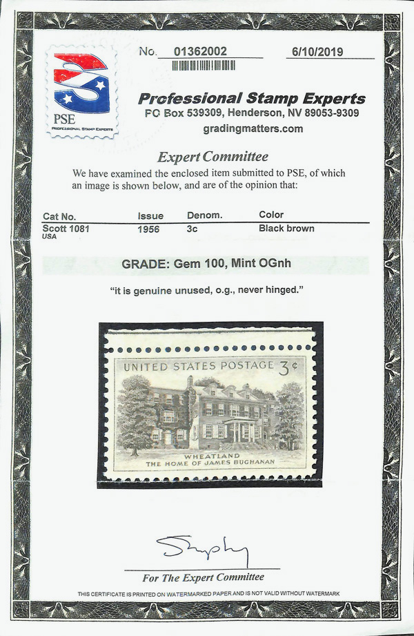 5643 nh 1081 image1956, 3¢ Wheatland (Scott 1081), o.g., never hinged, Superb, with 2019 P.S.E. certificate graded GEM 100.