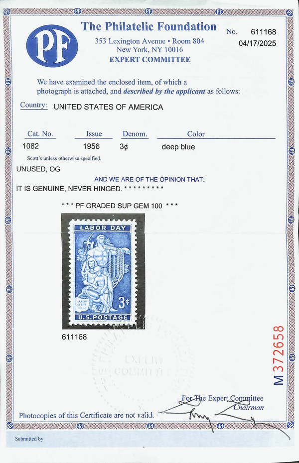 5644 nh 1082 image1956, 3¢ Labor Day (Scott 1082), o.g., never hinged, Superb, with 2025 P.F. certificate graded GEM 100.