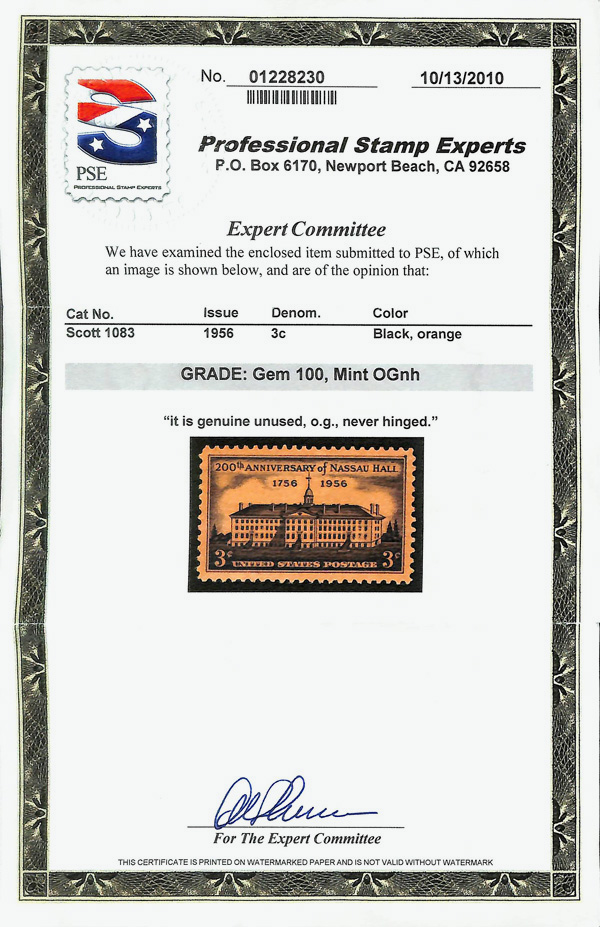 5645 nh 1083 image1956, 3¢ Nassau Hall (Scott 1083), o.g., never hinged, Superb, with 2010 P.S.E. certificate graded GEM 100.