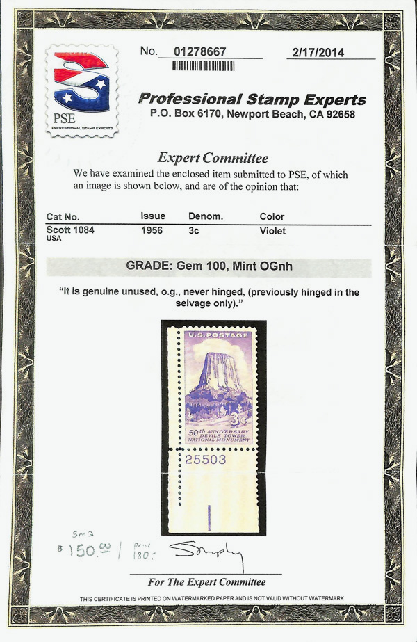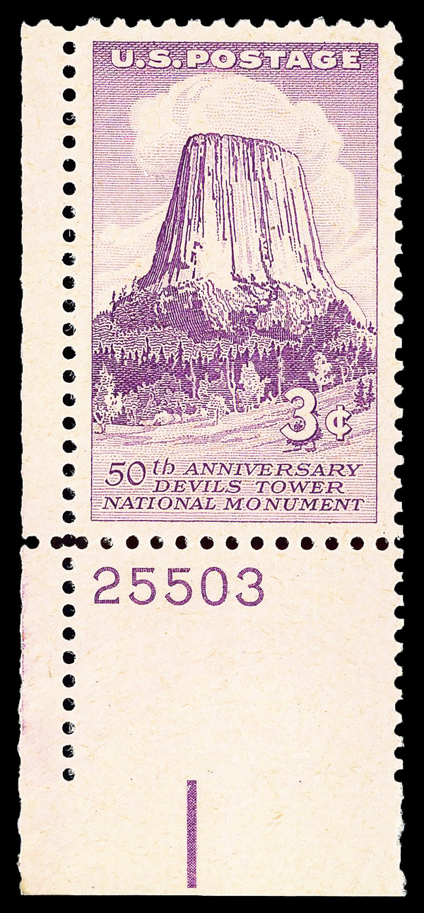 5646 nh/og 1084 image1956, 3¢ Devils Tower (Scott 1084), plate number single, o.g., stamp never hinged, hinged in selvage only, Superb, with 2014 P.S.E. certificate graded GEM 100.