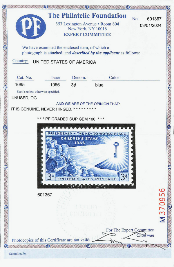 5647 nh 1085 image1956, 3¢ Children (Scott 1085), o.g., never hinged, Superb, with 2024 P.F. certificate graded GEM 100.