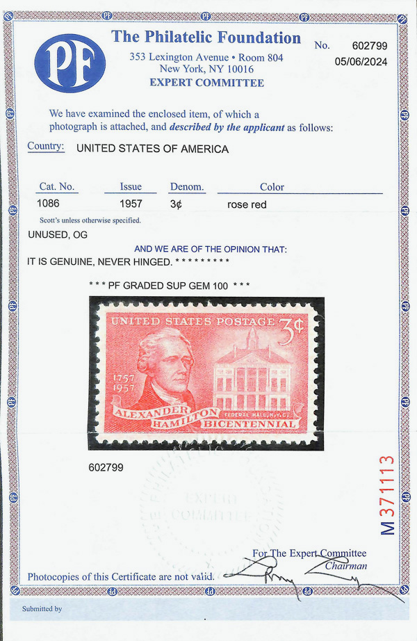 5648 nh 1086 image1957, 3¢ Alexander Hamilton (Scott 1086), o.g., never hinged, Superb, with 2024 P.F. certificate graded GEM 100.