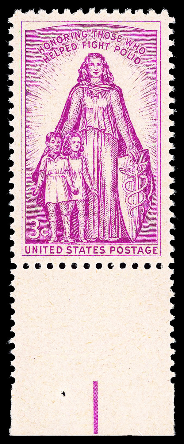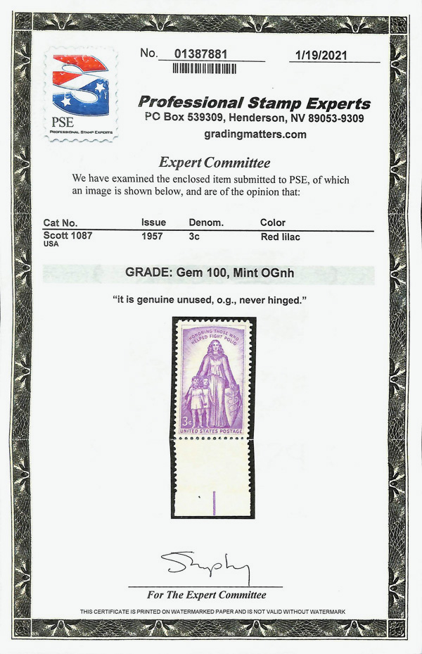 5649 nh 1087 image1957, 3¢ Polio (Scott 1087), o.g., never hinged, Superb, with 2021 P.S.E. certificate graded GEM 100.