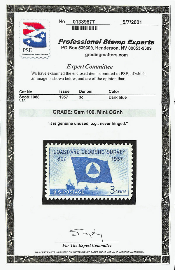 5650 nh 1088 image1957, 3¢ Coast & Geodetic Survey (Scott 1088), o.g., never hinged, Superb, with 2021 P.S.E. certificate graded GEM 100.