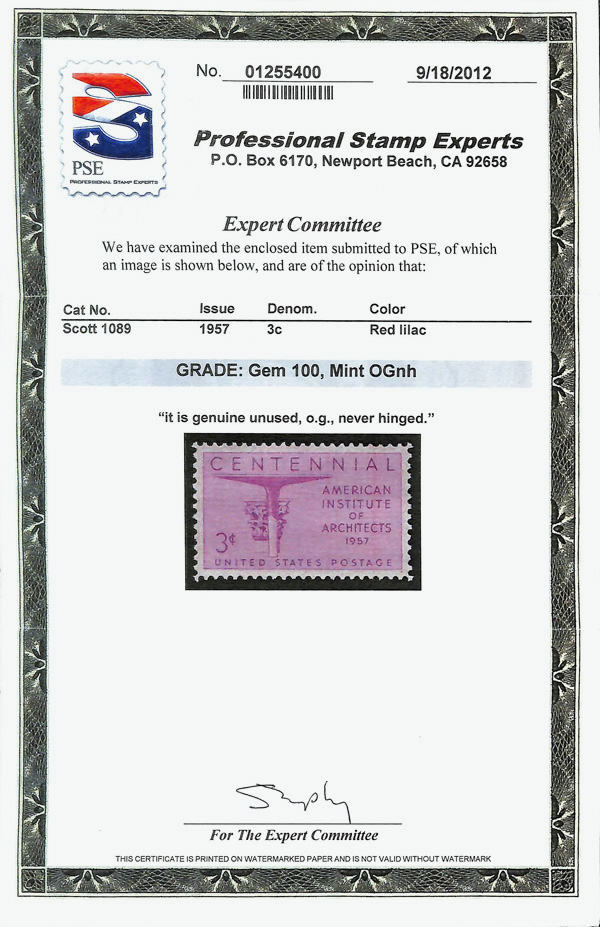 5651 nh 1089 image1957, 3¢ Architects (Scott 1089), o.g., never hinged, Superb, with 2012 P.S.E. certificate graded GEM 100.