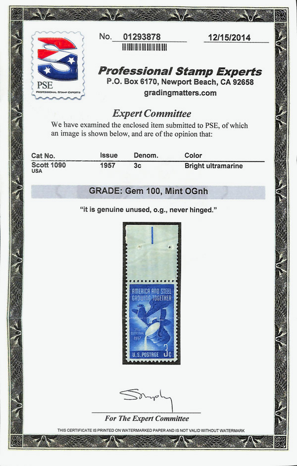 5652 nh 1090 image1957, 3¢ Steel Industry (Scott 1090), o.g., never hinged, Superb, with 2014 P.S.E. certificate graded GEM 100.