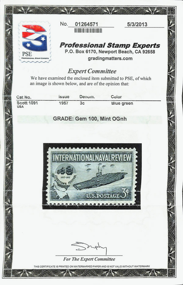 5653 nh 1091 image1957, 3¢ International Naval Review (Scott 1091), o.g., never hinged, Superb, with 2013 P.S.E. certificate graded GEM 100.