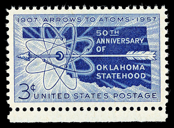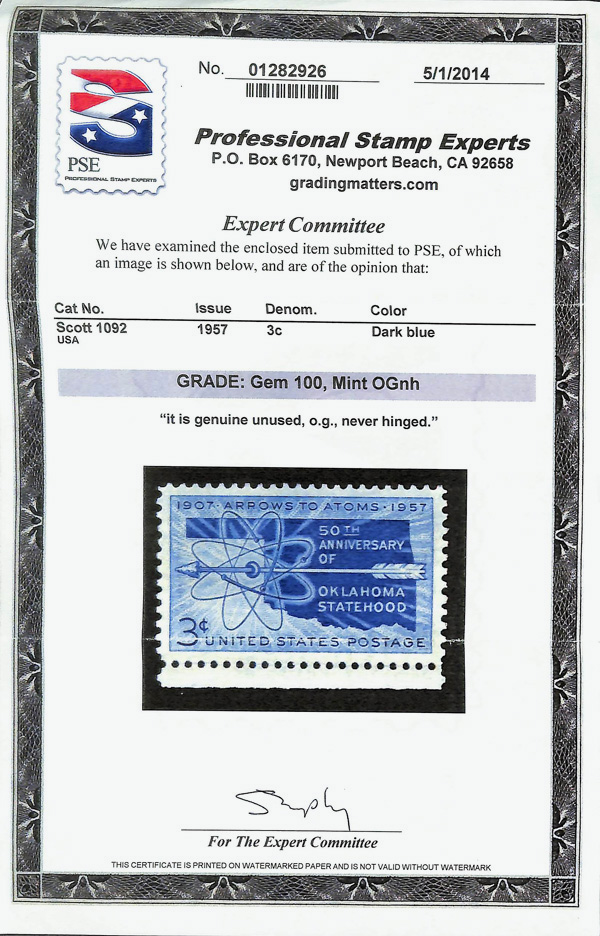 5654 nh 1092 image1957, 3¢ Oklahoma Statehood (Scott 1092), o.g., never hinged, Superb, with 2014 P.S.E. certificate graded GEM 100.