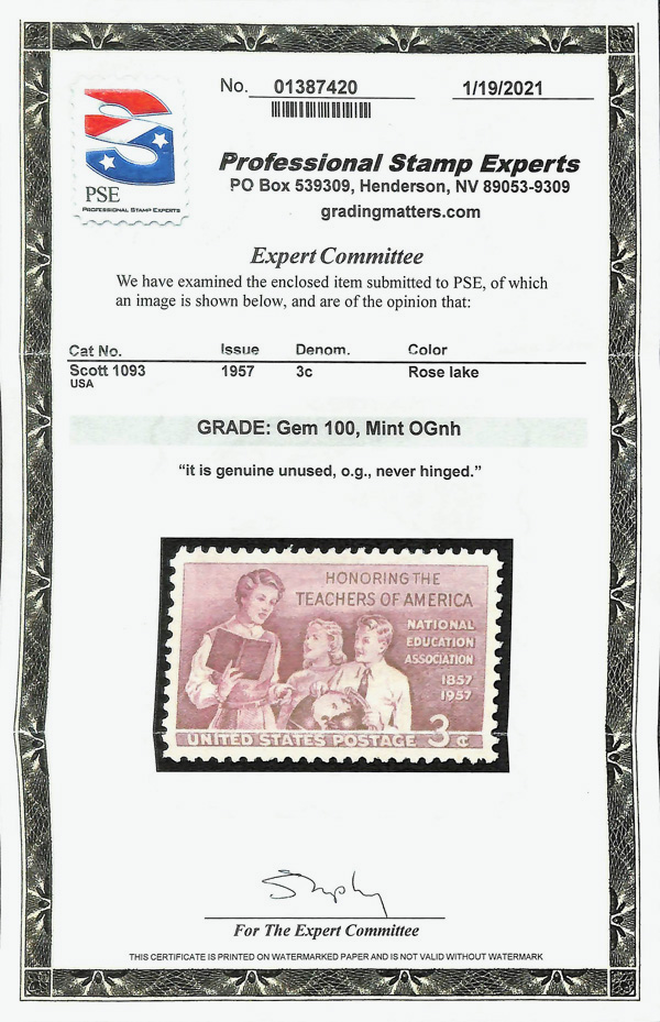5655 nh 1093 image1957, 3¢ Teachers (Scott 1093), o.g., never hinged, Superb, with 2021 P.S.E. certificate graded GEM 100.