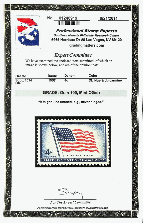 5656 nh 1094 image1957, 3¢ Old Glory (Scott 1094), o.g., never hinged, Superb, with 2011 P.S.E. certificate graded GEM 100.