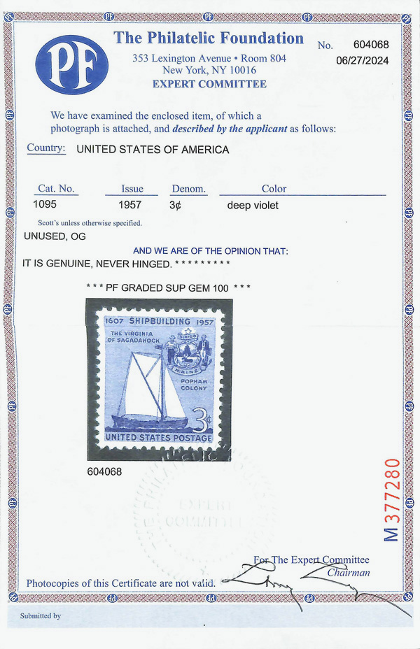 5657 nh 1095 image1957, 3¢ Ship Building (Scott 1095), o.g., never hinged, Superb, with 2024 P.F. certificate graded GEM 100.