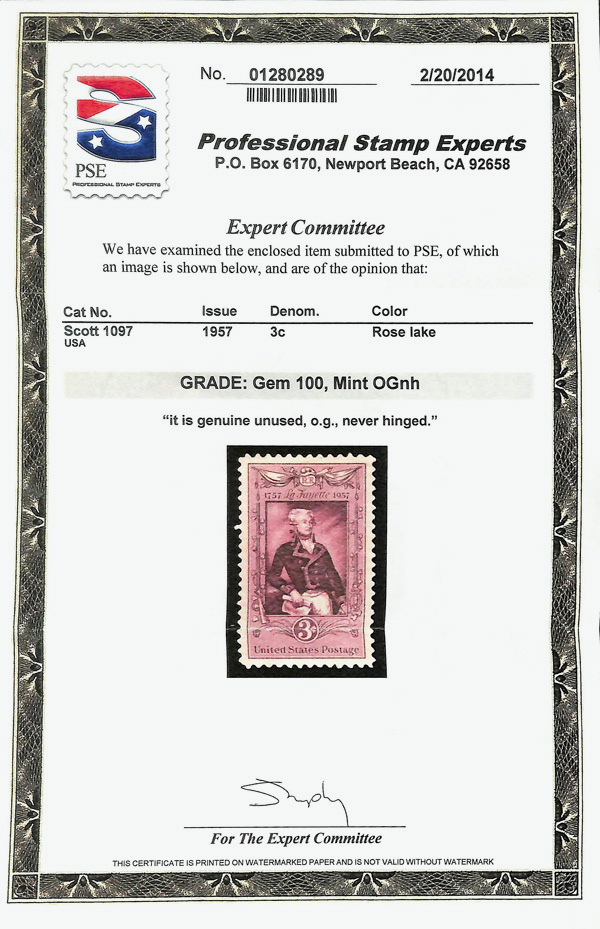 5658 nh 1097 image1957, 3¢ Lafayette (Scott 1097), o.g., never hinged, Superb, with 2014 P.S.E. certificate graded GEM 100.