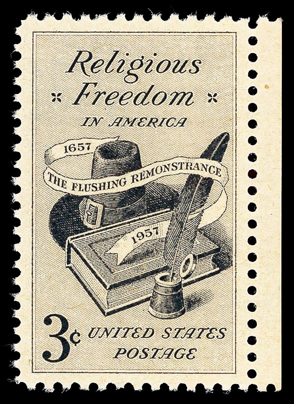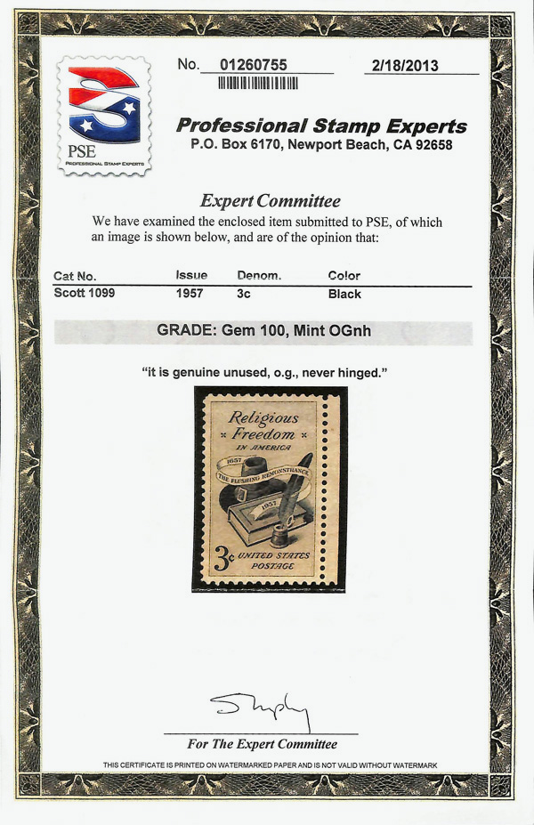 5660 nh 1099 image1957, 3¢ Religious Freedom (Scott 1099), o.g., never hinged, Superb, with 2013 P.S.E. certificate graded GEM 100.