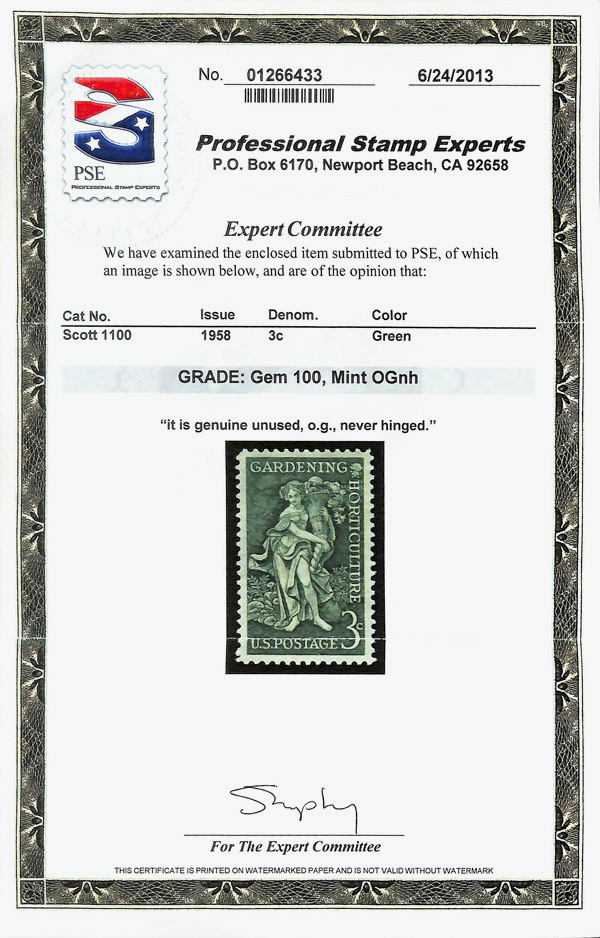 5661 nh 1100 image1958, 3¢ Gardening (Scott 1100), o.g., never hinged, Superb, with 2013 P.S.E. certificate graded GEM 100.