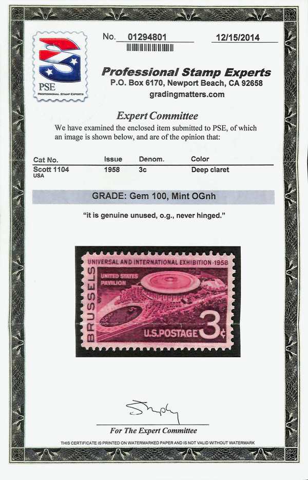 5662 nh 1104 image1958, 3¢ Brussels Exhibition (Scott 1104), o.g., never hinged, Superb, with 2014 P.S.E. certificate graded GEM 100.