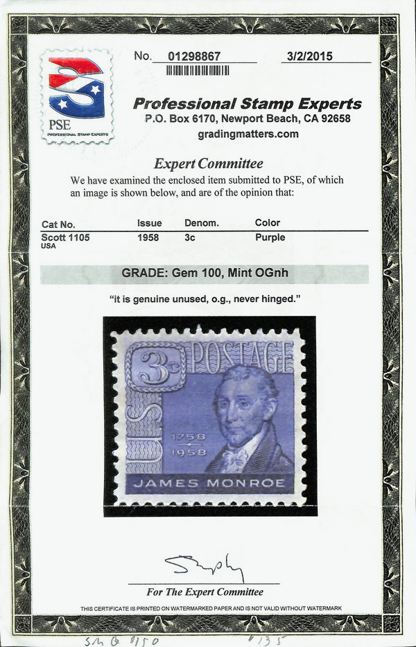5663 nh 1105 image1958, 3¢ James Monroe (Scott 1105), o.g., never hinged, Superb, with 2015 P.S.E. certificate graded GEM 100.