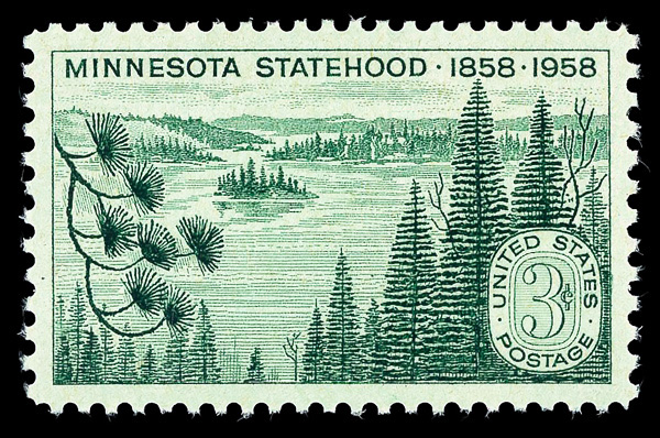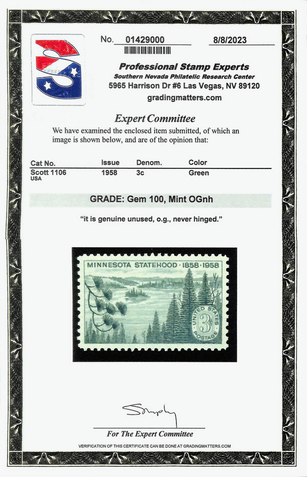 5664 nh 1106 image1958, 3¢ Minnesota Statehood (Scott 1106), o.g., never hinged, Superb, with 2023 P.S.E. certificate graded GEM 100.