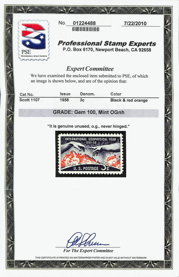 5665 nh 1107 image1958, 3¢ International Geophysical Year (Scott 1107), o.g., never hinged, Superb, with 2010 P.S.E. certificate graded GEM 100.