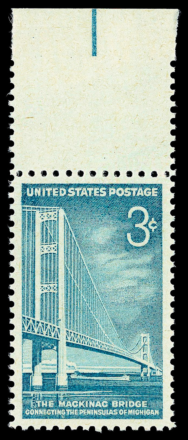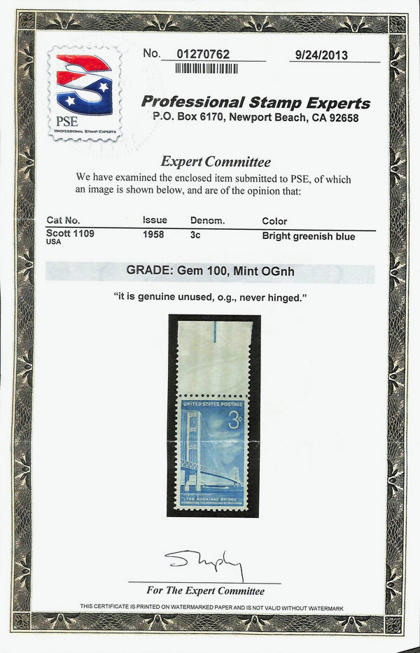 5667 nh 1109 image1958, 3¢ Mackinac Bridge (Scott 1109), o.g., never hinged, Superb, with 2013 P.S.E. certificate graded GEM 100.