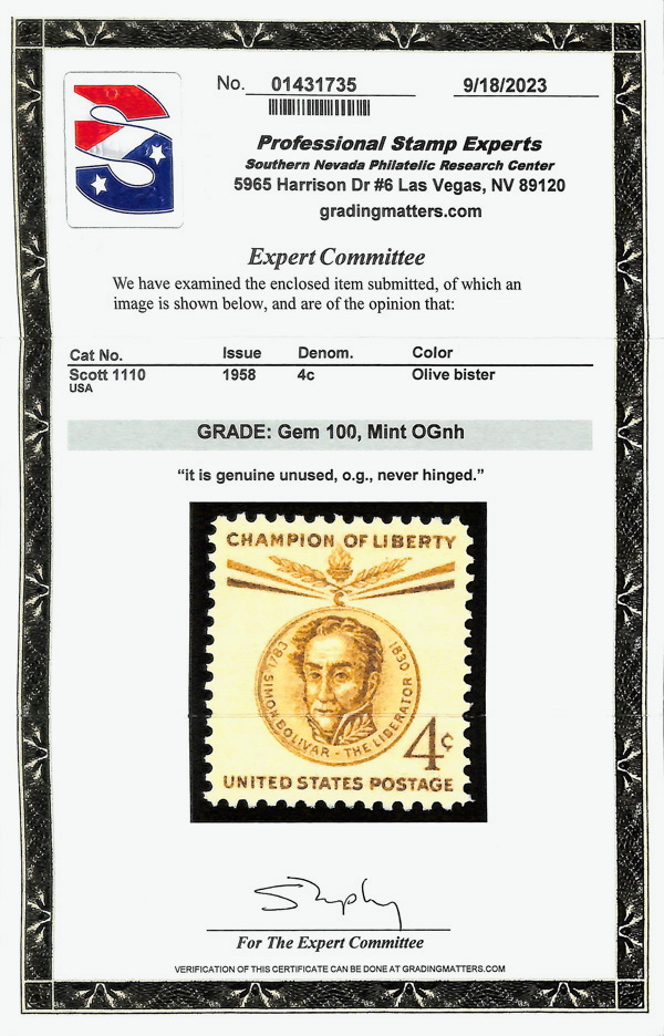 5668 nh 1110 image1958, 4¢ Champion of Liberty: Simon Bolívar (Scott 1110), o.g., never hinged, Superb, with 2023 P.S.E. certificate graded GEM 100.