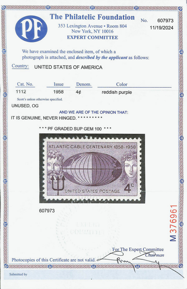 5669 nh 1112 image1958, 4¢ Atlantic Cable (Scott 1112), o.g., never hinged, Superb, with 2024 P.F. certificate graded GEM 100.