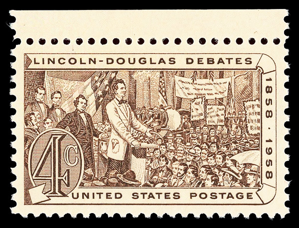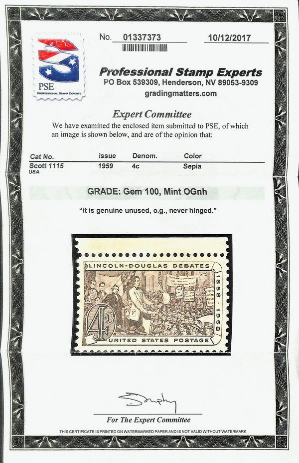 5670 nh 1115 image1958, 4¢ Lincoln-Douglas Debates (Scott 1115), o.g., never hinged, Superb, with 2017 P.S.E. certificate graded GEM 100.