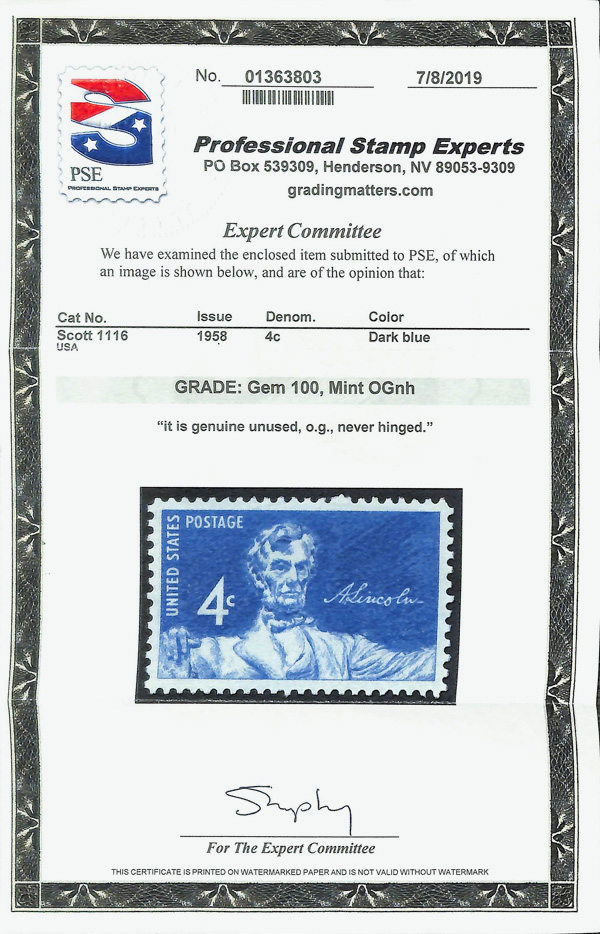 5671 nh 1116 image1959, 4¢ Lincoln (Scott 1116), o.g., never hinged, Superb, with 2019 P.S.E. certificate graded GEM 100.