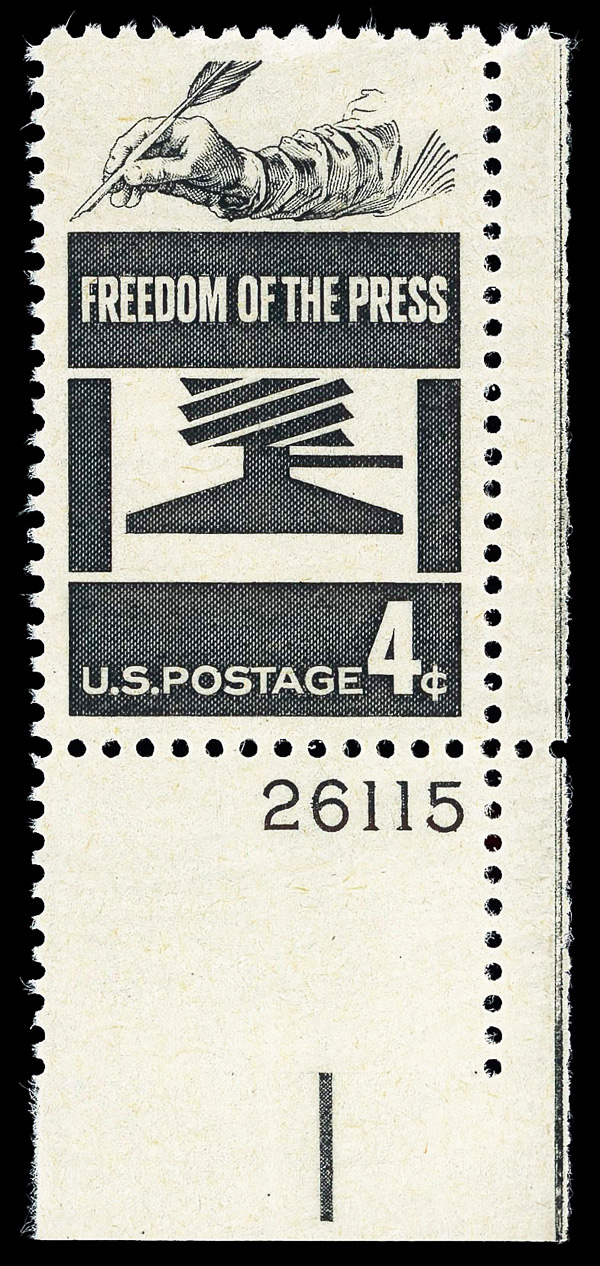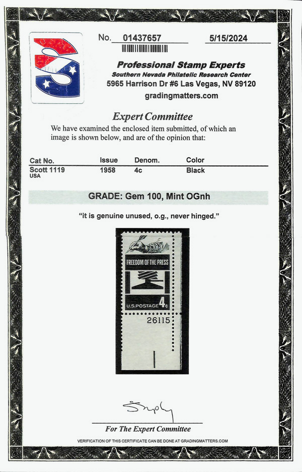 5672 nh 1119 image1958, 4¢ Freedom of the Press (Scott 1119), plate number single, o.g., never hinged, Superb, with 2024 P.S.E. certificate graded GEM 100.