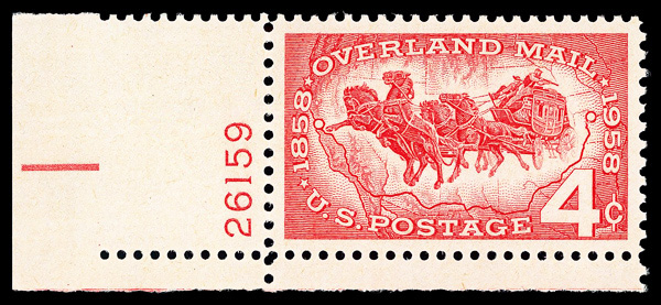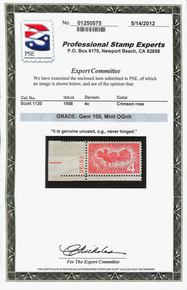 5673 nh 1120 image1958, 4¢ Overland Mail (Scott 1120), plate number single, o.g., never hinged, Superb, with 2012 P.S.E. certificate graded GEM 100.