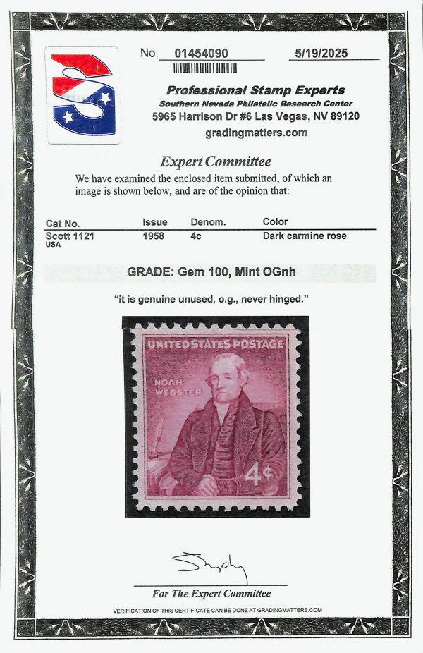 5674 nh 1121 image1958, 4¢ Noah Webster (Scott 1121), o.g., never hinged, Superb, with 2025 P.S.E. certificate graded GEM 100.