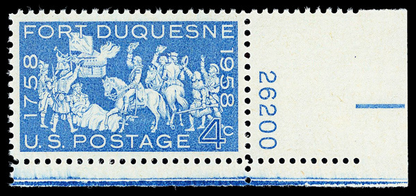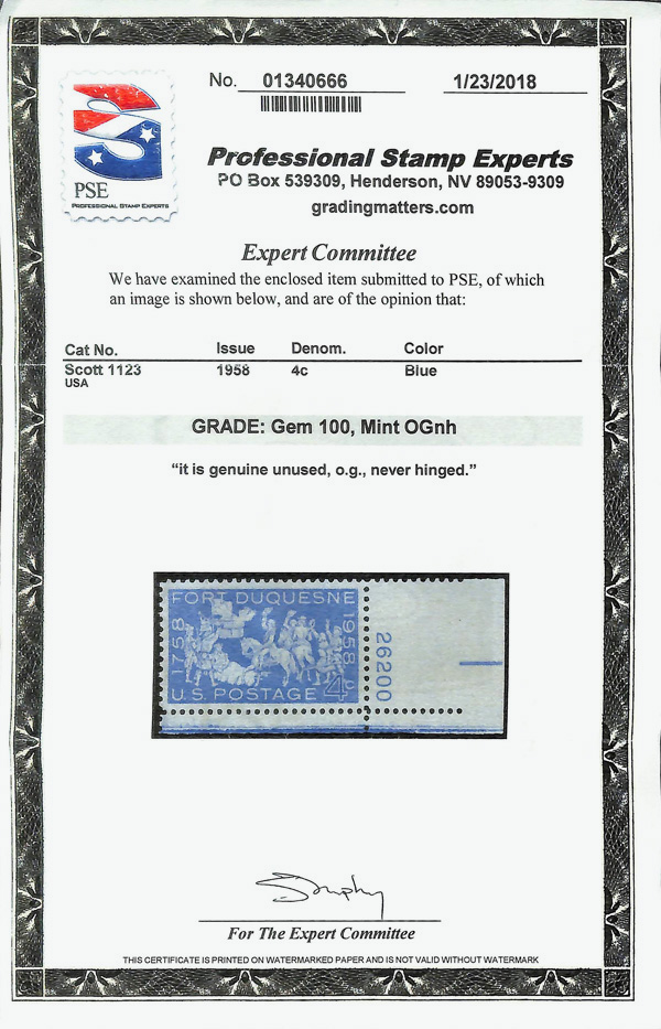 5675 nh 1123 image1958, 4¢ Fort Duquesne (Scott 1123), plate number single, o.g., never hinged, Superb, with 2018 P.S.E. certificate graded GEM 100.