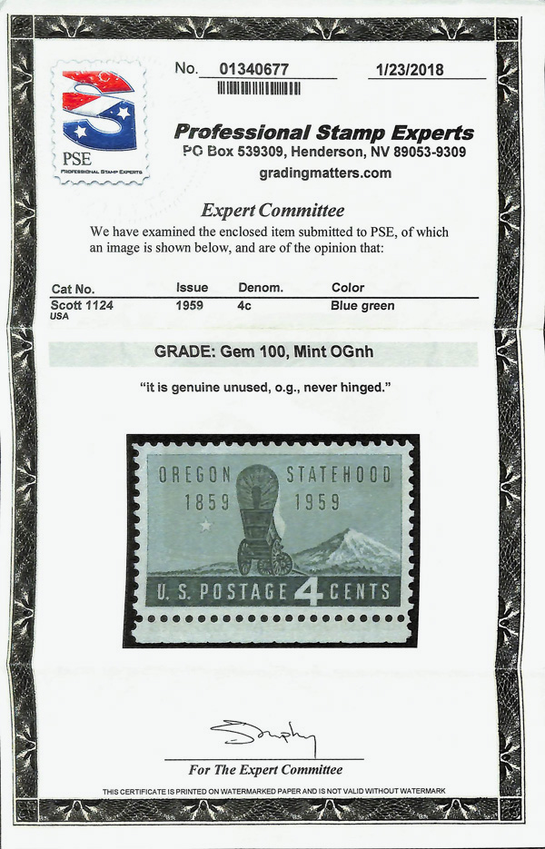 5676 nh 1124 image1959, 4¢ Oregon Statehood (Scott 1124), o.g., never hinged, Superb, with 2018 P.S.E. certificate graded GEM 100.