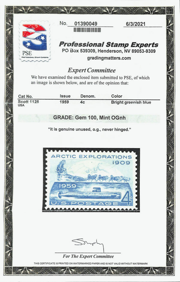 5677 nh 1128 image1959, 4¢ Arctic Explorations (Scott 1128), o.g., never hinged, Superb, with 2021 P.S.E. certificate graded GEM 100.