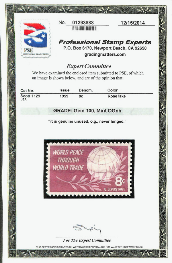 5678 nh 1129 image1959, 8¢ World Peace Through World Trade (Scott 1129), o.g., never hinged, Superb, with 2014 P.S.E. certificate graded GEM 100.
