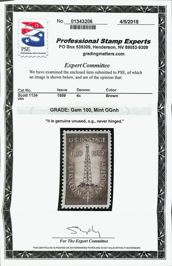 5679 nh 1134 image1959, 4¢ Petroleum Industry (Scott 1134), o.g., never hinged, Superb, with 2018 P.S.E. certificate graded GEM 100.