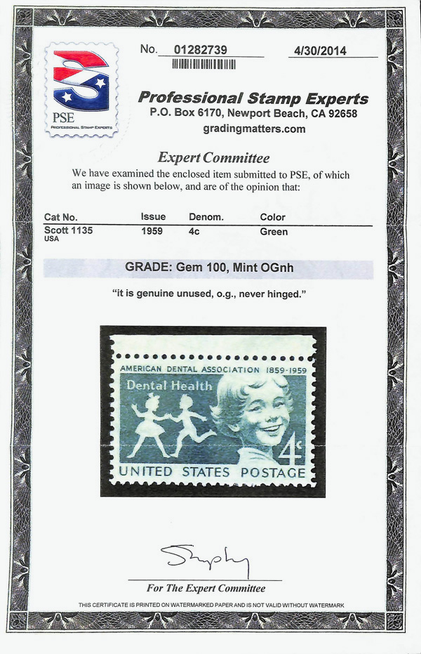5680 nh 1135 image1959, 4¢ Dental Health (Scott 1135), o.g., never hinged, Superb, with 2014 P.S.E. certificate graded GEM 100.