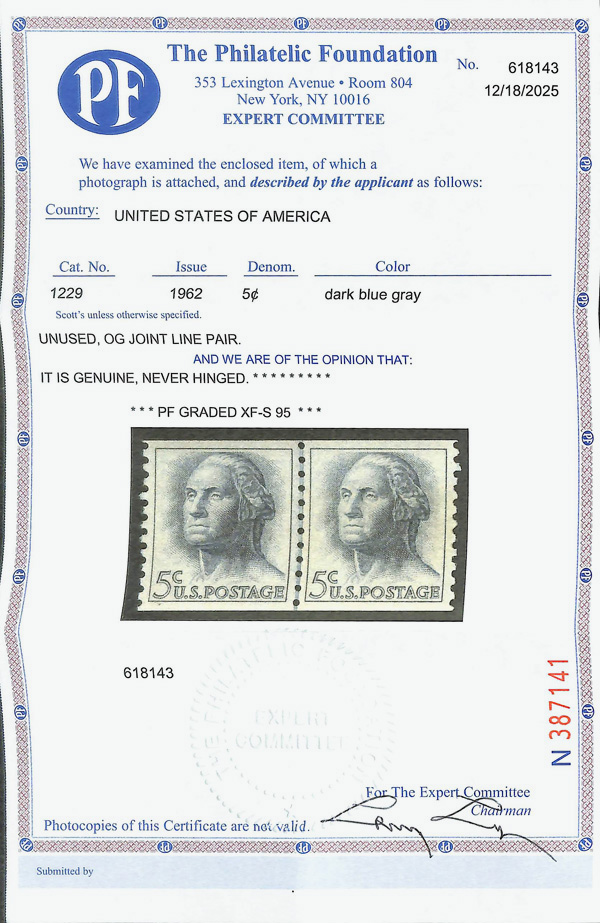 5699 nh 1229 image1962, 5¢ Washington, horizontal coil (Scott 1229), joint line pair, o.g., never hinged, Extremely Fine to Superb, with 2025 P.F. certificate graded XF-SUP 95.