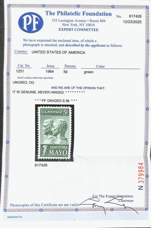 5701 nh 1251 image1964, 5¢ Doctors Mayo (Scott 1251), o.g., never hinged, Superb, with 2025 P.F. certificate graded SUP 98.